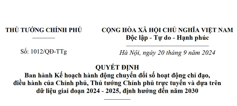 Quyết định 1012/QĐ-TTg ngày 20/9/2024: Ban hành Kế hoạch hành động chuyển đổi số hoạt động chỉ đạo, điều hành của Chính phủ, Thủ tướng Chính phủ trực tuyến và dựa trên dữ liệu giai đoạn 2024-2025, định hướng đến năm 2030